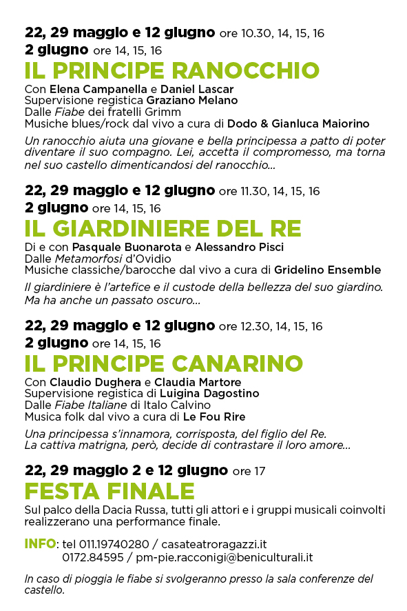 Domenica 22 e 29 maggio, giovedì 2 e domenica 12 giugno, il Castello e il Parco di Racconigi saranno la preziosa cornice in cui prenderanno vita le fiabe della tradizione europea colta e popolare, drammatizzate dai migliori attori della Fondazione TRG Onlus e accompagnate da musicisti.