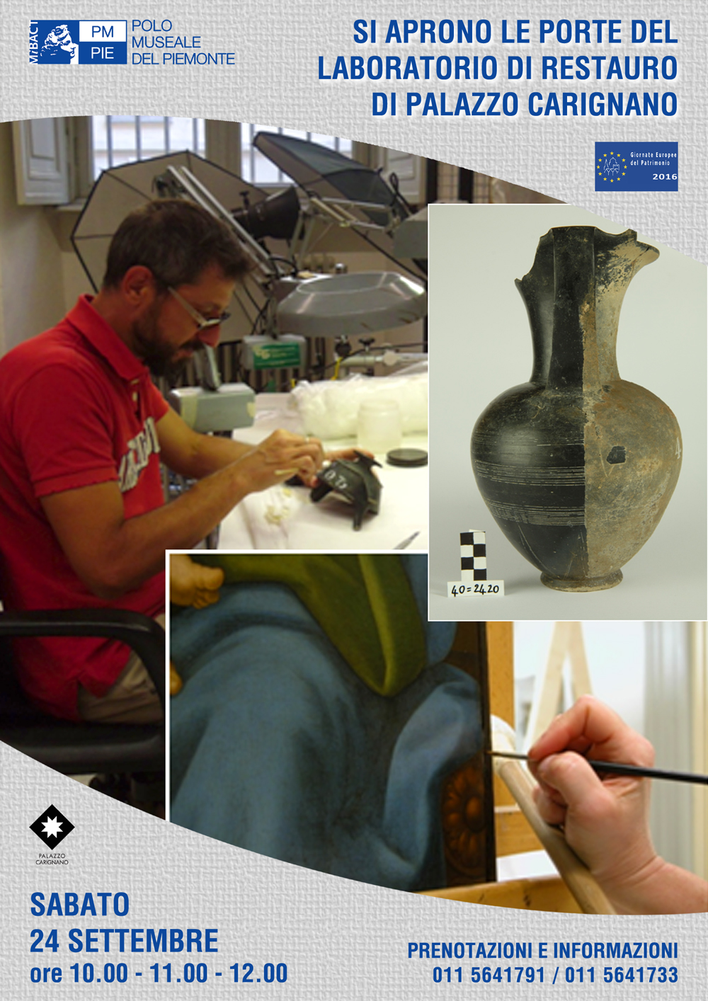 All’interno di ambienti antichi trasformati per adeguarsi ad una professione divenuta sempre più tecnologica si interviene per recuperare e conservare opere del patrimonio culturale provenienti dal territorio piemontese e dalle sue ricche realtà museali. I visitatori saranno accompagnati alla loro scoperta; si potranno vedere i principali lavori di restauro conclusi, quelli in corso o di imminente avvio. Nel corso della visita saranno descritti i primi saggi di pulitura effettuati sui manufatti ceramici della collezione etrusca proveniente dagli scavi della città di Veio, conservati presso il Castello ducale di Aglié. Si tratta di un nucleo di oggetti, finora mai esposti al pubblico, dei quali verranno descritte le peculiarità tecniche e conservative che impronteranno l’intervento di restauro.