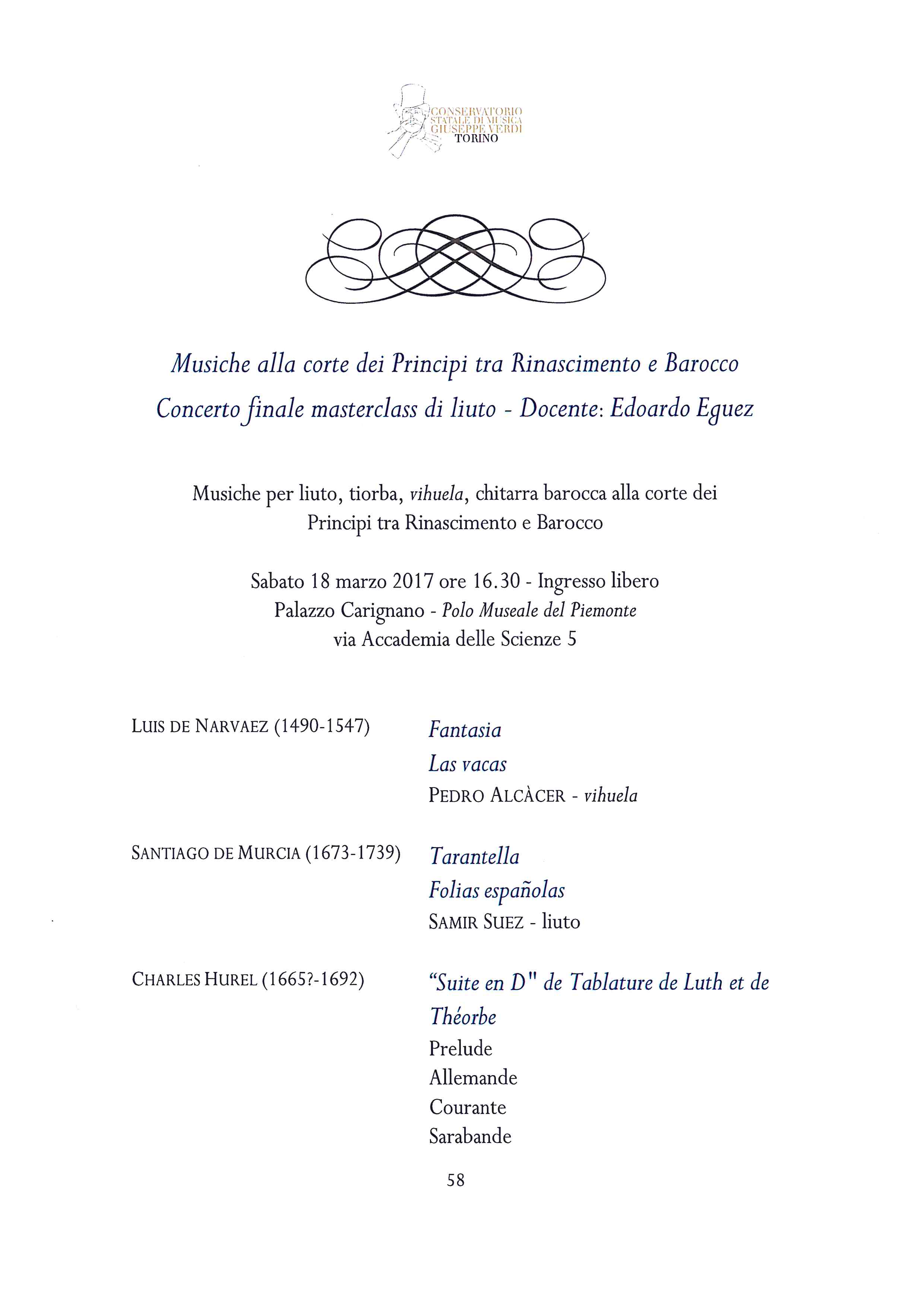 Alle 16,30 nel Salone d’onore del Palazzo la Master Class di liuto tenuta dal Maestro Edoardo Eguez darà vita al concerto Musiche alla corte dei Principi tra Rinascimento e Barocco.