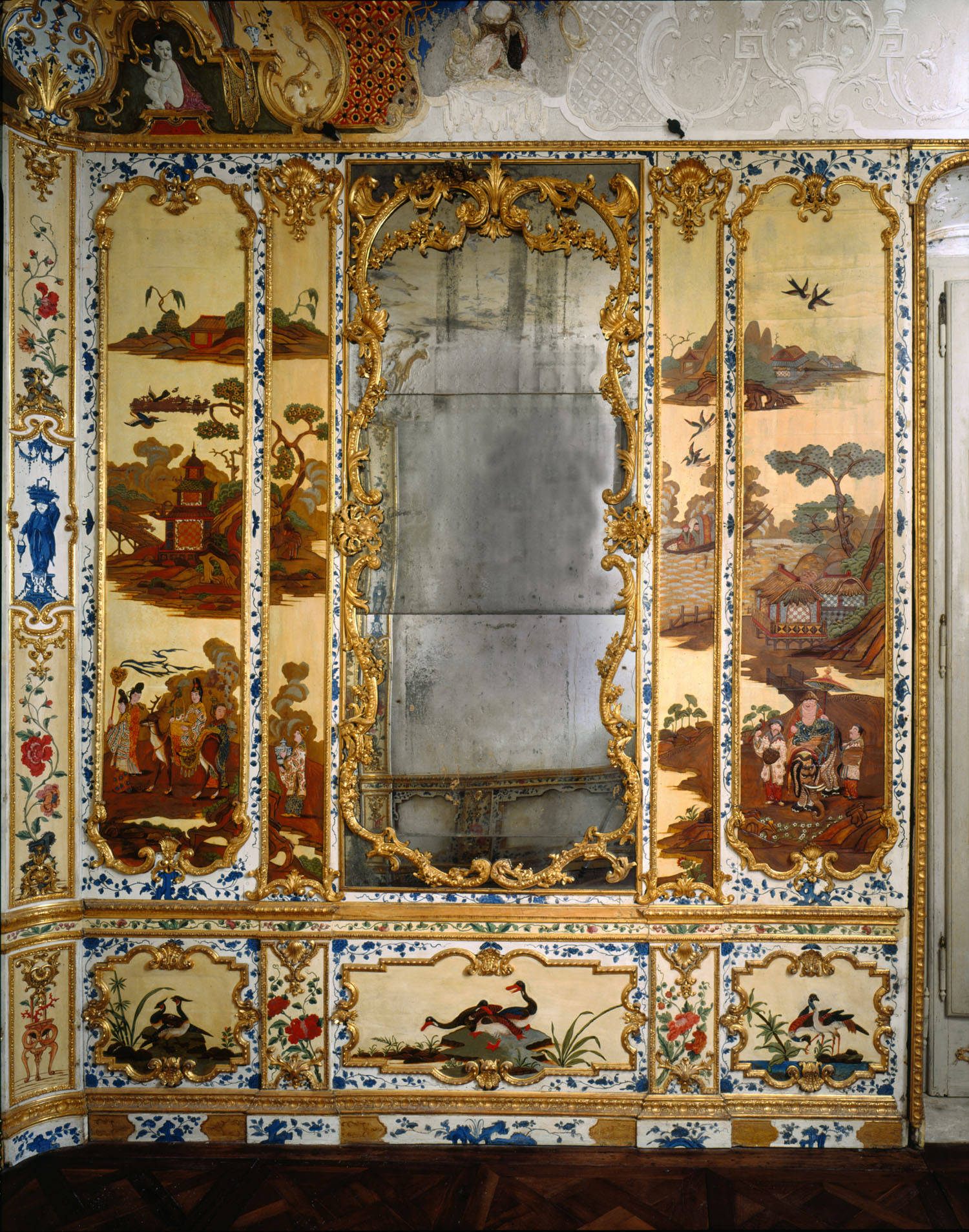 Nella prima metà del Settecento la moda dell’Oriente ha contagiato tutta l’Europa e le dimore nobiliari si arricchiscono di oggetti giunti nel continente sulle navi mercantili dopo lunghi viaggi iniziati nei porti della Cina: statuette e vasellame in porcellana, mobili e cofanetti in lacca, sete e carte dipinte. Anche a Villa della Regina vengono realizzati ambienti in stile grazie all’abilità di artisti piemontesi che imitano le tecniche delle botteghe orientali con grande raffinatezza e maestria. Il mondo orientale visto attraverso occhi torinesi.