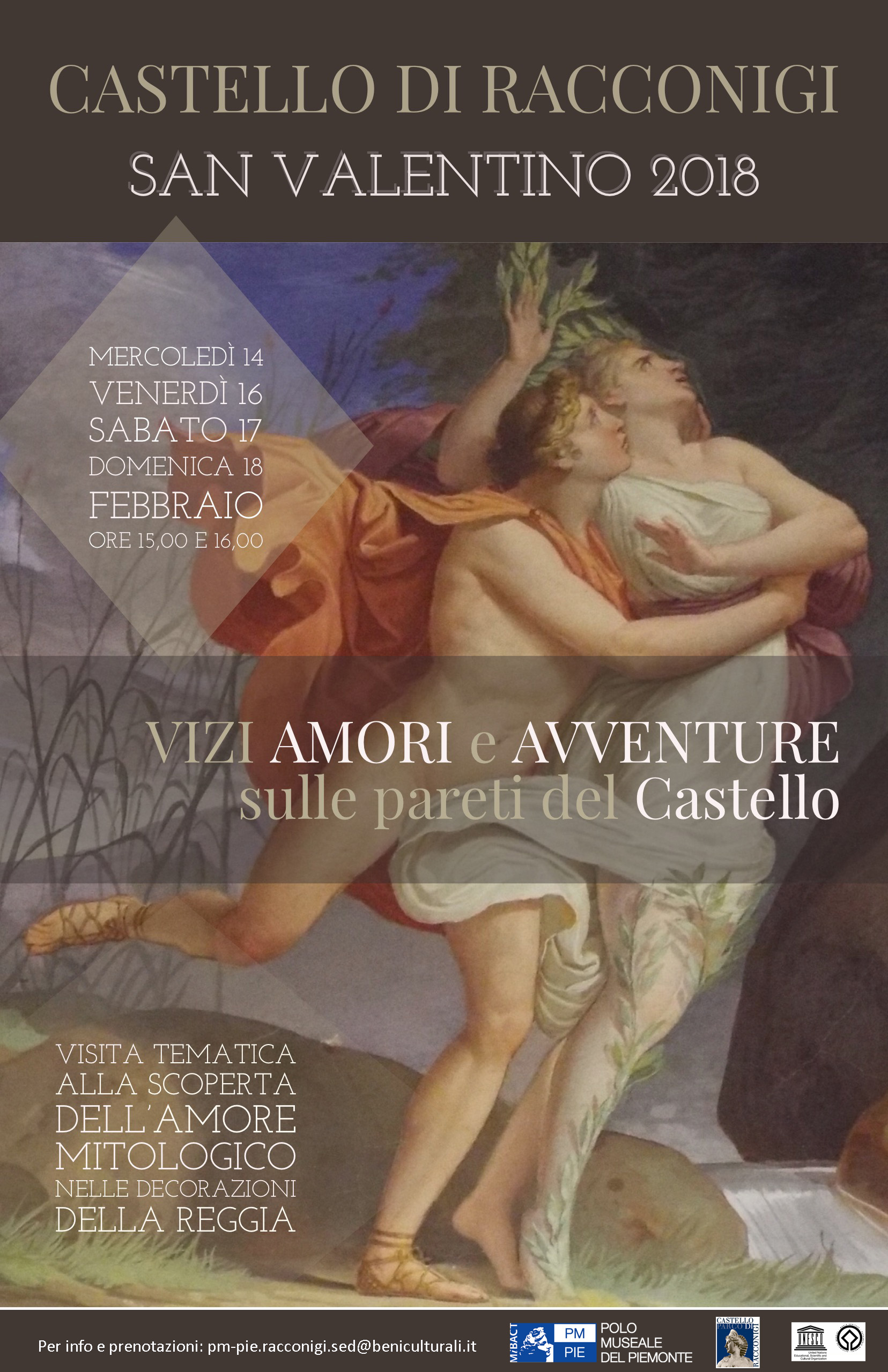 Al Castello di Racconigi San Valentino vi aspetta mercoledì 14, venerdì 16, sabato 17 e domenica 18 febbraio: ogni giorno due visite guidate, alle 15.00 e alle 16.00, dal titolo