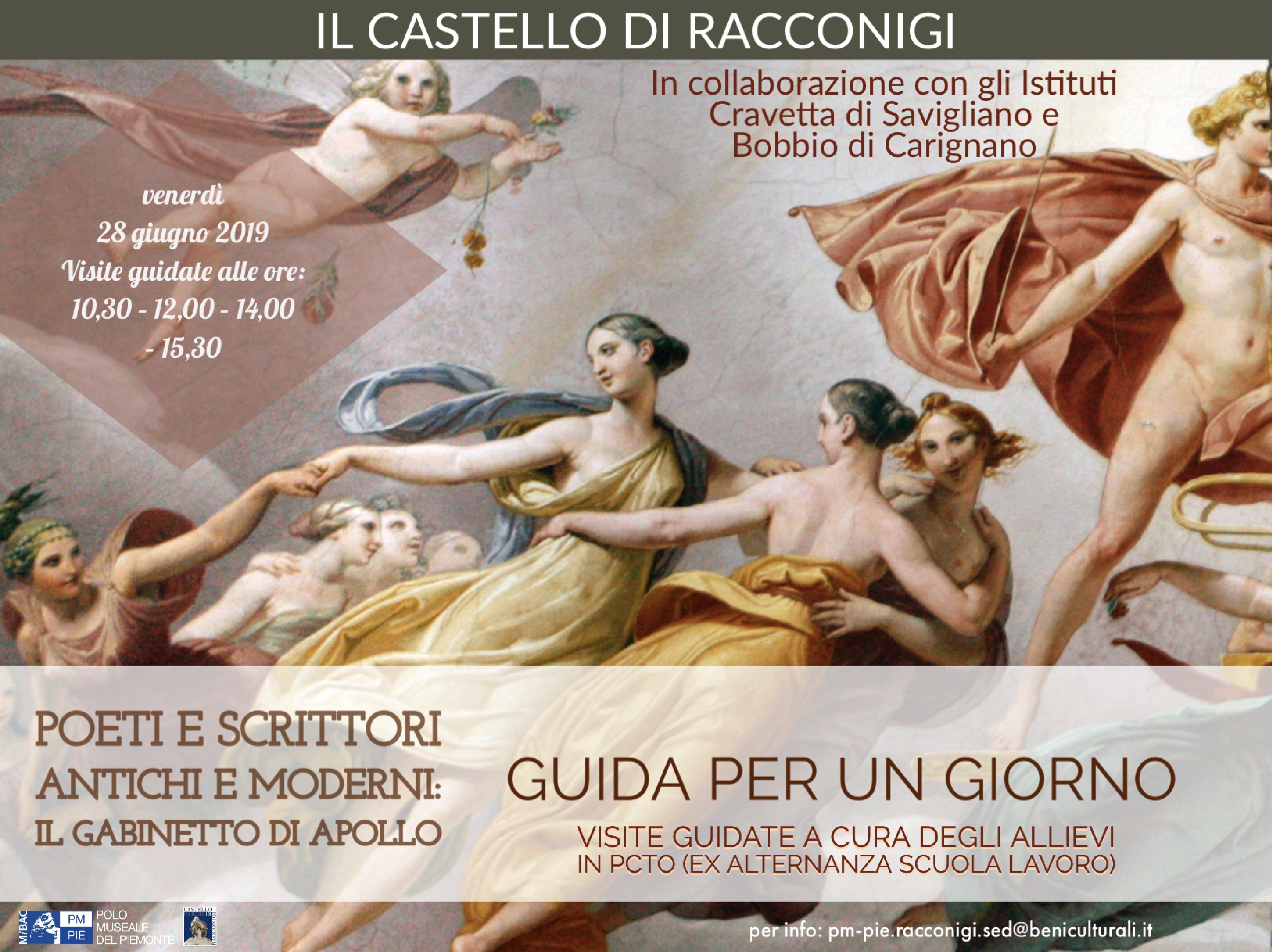 gli studenti in PCTO (ex alternanza scuola-lavoro) degli Istituti Cravetta di Savigliano e Bobbio di Carignano accoglieranno il pubblico per una visita speciale agli ambienti e alle collezioni del Castello di Racconigi dal titolo “Poeti e scrittori antichi e moderni: il Gabinetto di Apollo”.