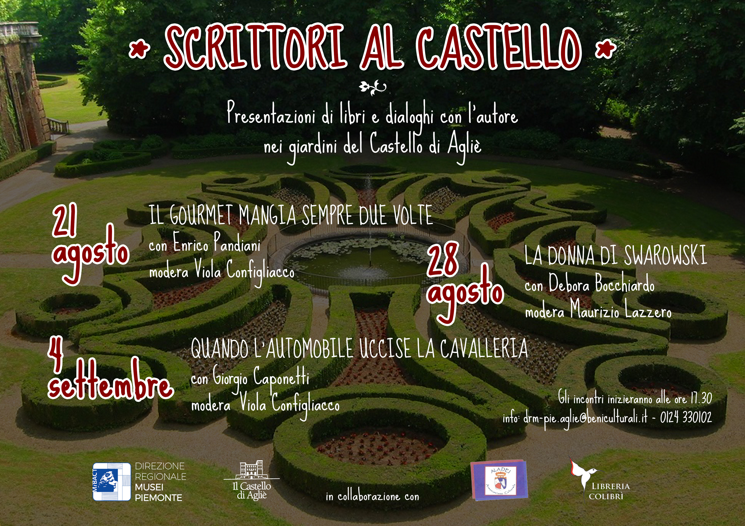 Nella suggestiva cornice del Giardino del Castello di Aglié tre appuntamenti estivi con i libri per la rassegna “Scrittori al Castello”, organizzata in collaborazione con l’Associazione Aladei e la Libreria Colibrì di Cuorgné.