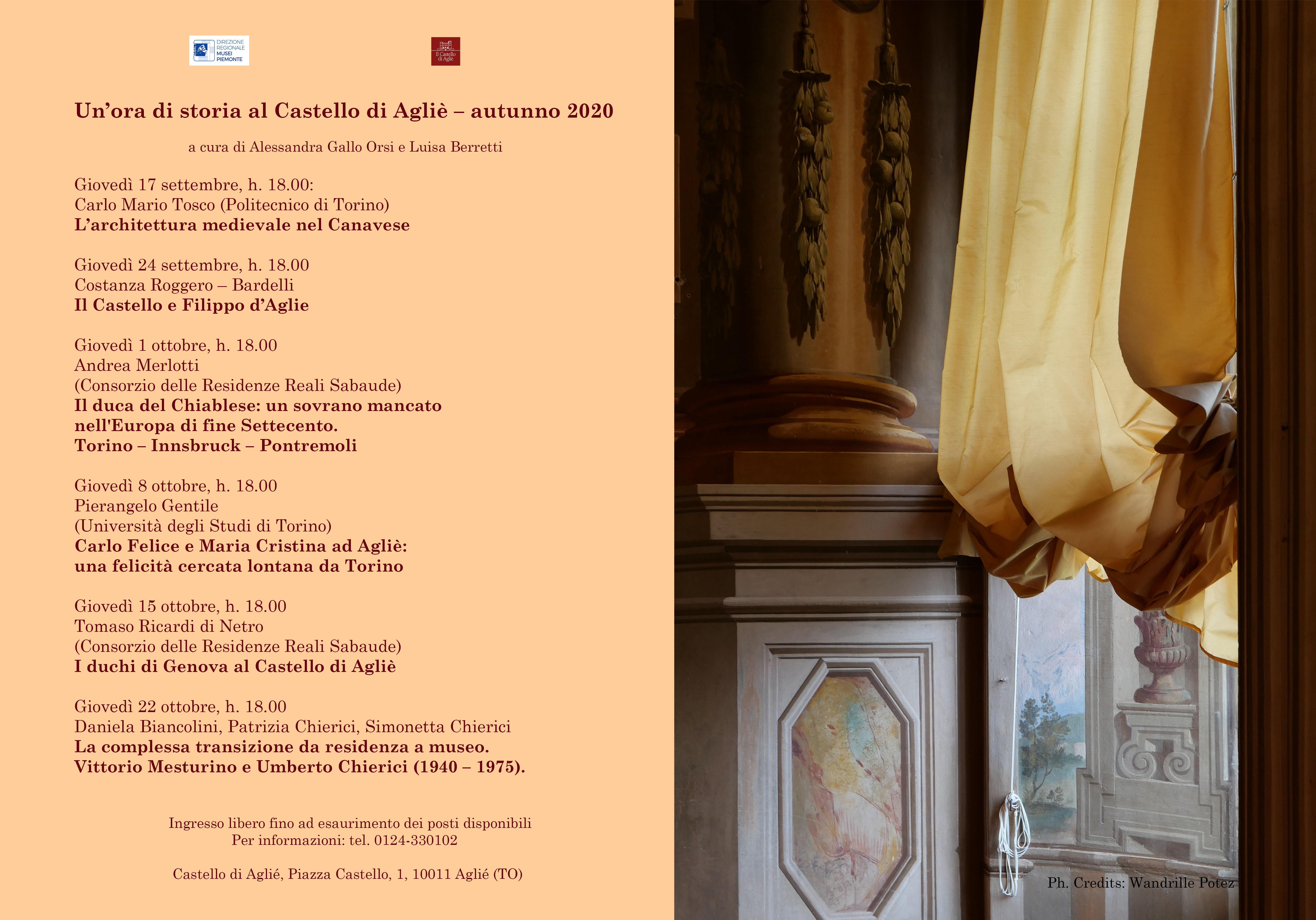 Ad aprire l’edizione di quest’anno è Carlo Mario Tosco, docente di Storia dell’Architettura al Politecnico di Torino, con un intervento sull’architettura medievale nel Canavese, dall’età romanica agli sviluppi del gotico, per proseguire poi con Costanza Roggero Bardelli, già docente di Storia dell’Architettura al Politecnico di Torino, che da tempo si occupa di Filippo San Martino d’Agliè, personaggio chiave per la storia della residenza al quale, con ogni probabilità, si deve la radicale trasformazione avvenuta intorno alla metà del Seicento. Un altro celebre proprietario e committente di importanti opere, Benedetto Maria Maurizio duca del Chiablese, è al centro della conferenza di Andrea Merlotti del Consorzio delle Residenze Reali Sabaude, in una prospettiva di strategie dinastiche e rapporti internazionali. I suoi eredi, Carlo Felice di Savoia e la moglie Maria Cristina di Borbone-Napoli, sono invece i protagonisti dell’incontro con Pierangelo Gentile dell’Università degli Studi di Torino, in quell’eco nostalgica per l’antico regime che indusse la coppia a preferire la dimensione agreste, e più retriva rispetto agli ambienti della capitale, in cui erano immerse le residenze extraurbane. Alla presenza e alle scelte dei duchi di Genova, ultimi proprietari blasonati del Castello, è dedicato l’appuntamento con Tomaso Ricardi di Netro del Consorzio delle Residenze Reali Sabaude, mentre sulla complessa trasformazione da residenza privata a museo intervengono Daniela Biancolini, già direttrice del Castello di Agliè e ideatrice della rassegna Un’ora di storia, e Patrizia e Simonetta Chierici, figlie di Umberto Chierici, il Soprintendente che promosse e coordinò le operazioni per permettere l’apertura al pubblico.
