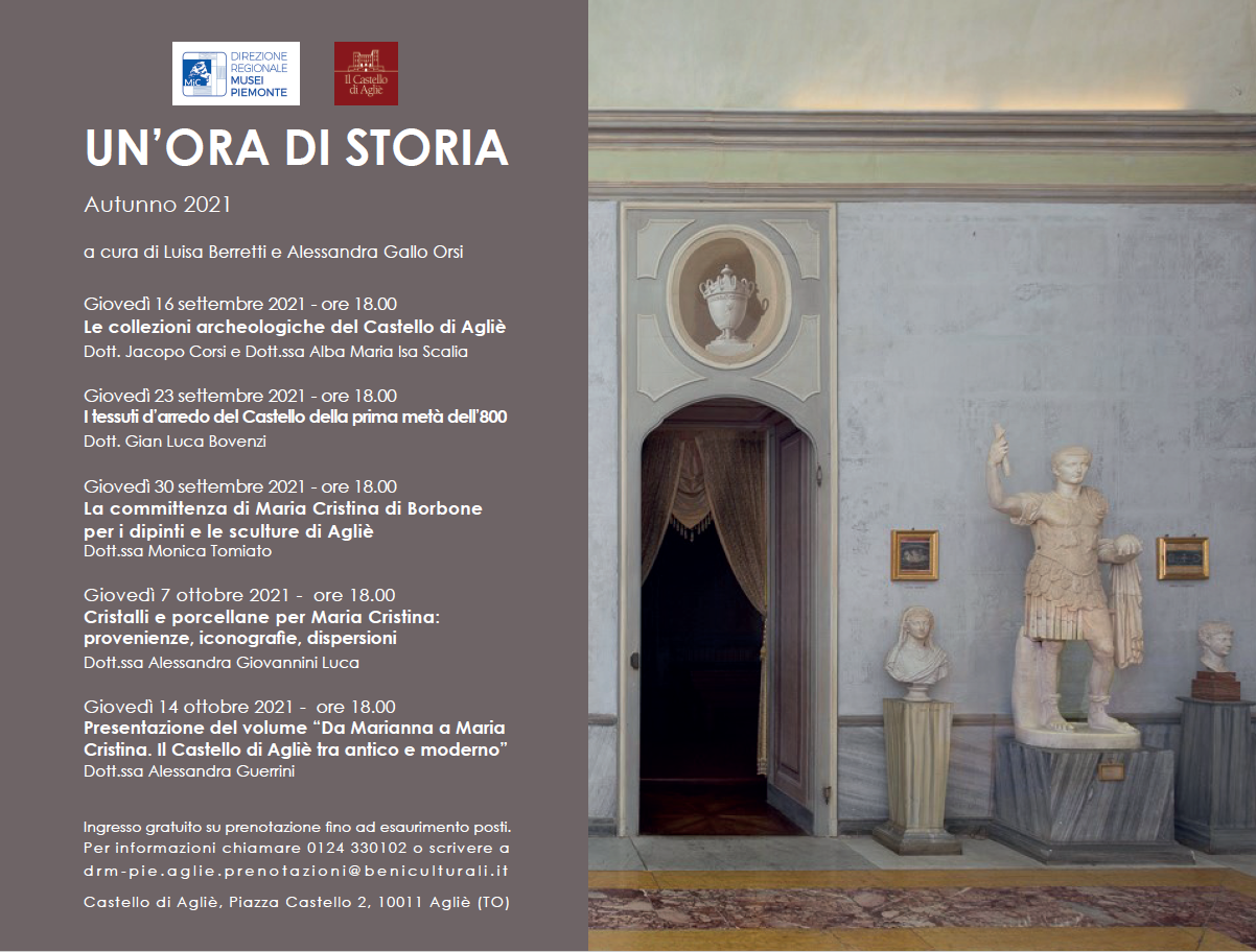 Dal 16 settembre al 14 ottobre, ogni giovedì alle ore 18, incontri sui temi trattati in occasione della giornata di studi Da Marianna a Maria Cristina: il Castello di Agliè tra antico e moderno (Torino, Palazzo Carignano, 23 novembre 2018), dedicata agli interessi archeologici e artistici di Carlo Felice di Savoia e della consorte Maria Cristina di Borbone-Napoli. Dopo la pubblicazione degli atti realizzata da Editris 2000 alla fine dello scorso anno, le conferenze in programma intendono proporre alcuni degli episodi narrati nel volume, permettendo di apprezzare le ricerche svolte dagli studiosi e ripercorrerne gli esiti in loco, anche attraverso un confronto diretto con opere d’arte e arredi.