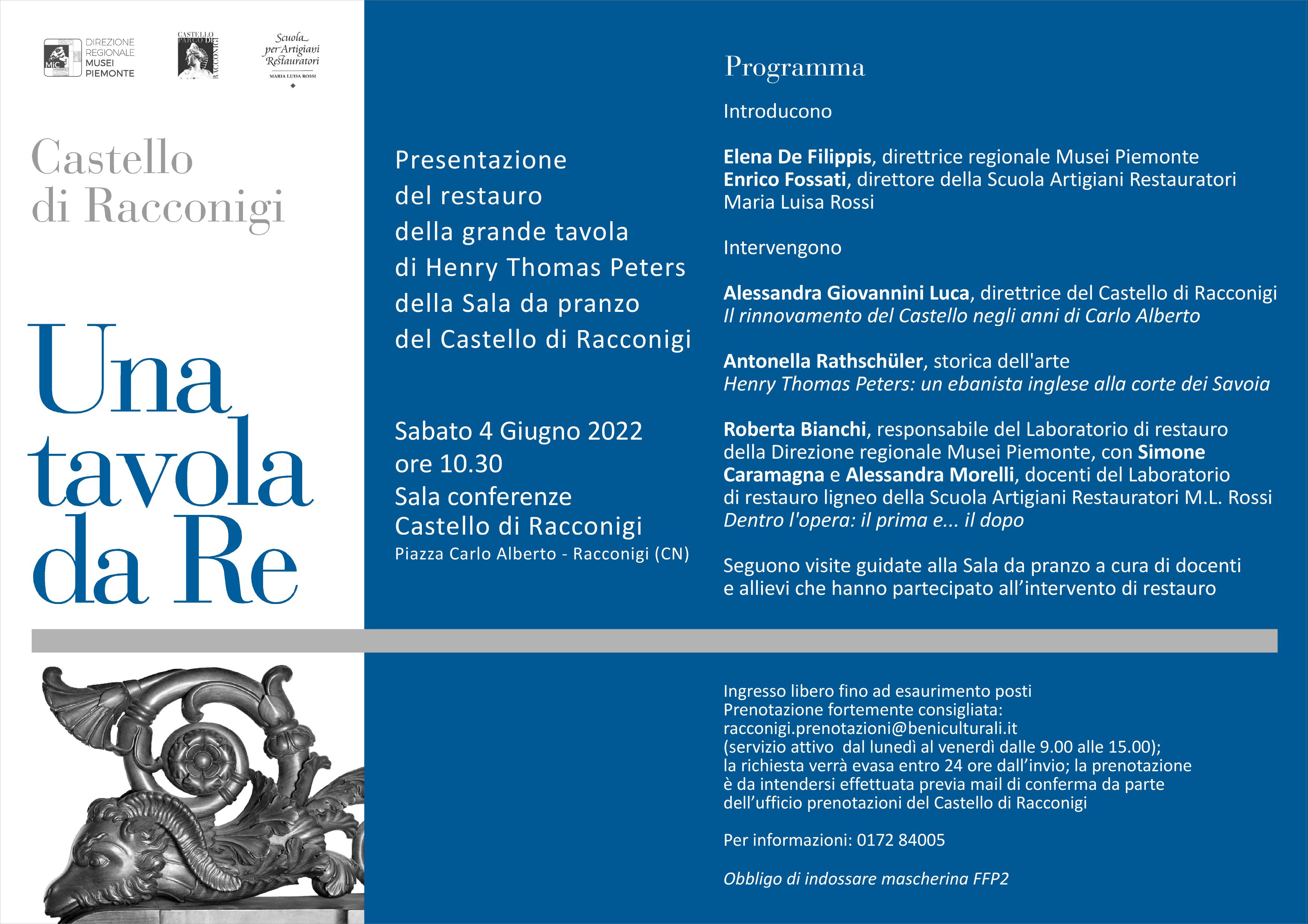Gli esiti delle attività eseguite sono al centro di una presentazione aperta al pubblico che si svolge sabato 4 giugno 2022 alle ore 10.30 nella Sala conferenze del Castello di Racconigi, con la partecipazione degli esperti di restauro che hanno diretto i lavori, nonché di studiosi di committenza sabauda, ebanisteria ottocentesca e, ovviamente, dell’eccezionale figura che fu Henry Thomas Peters.