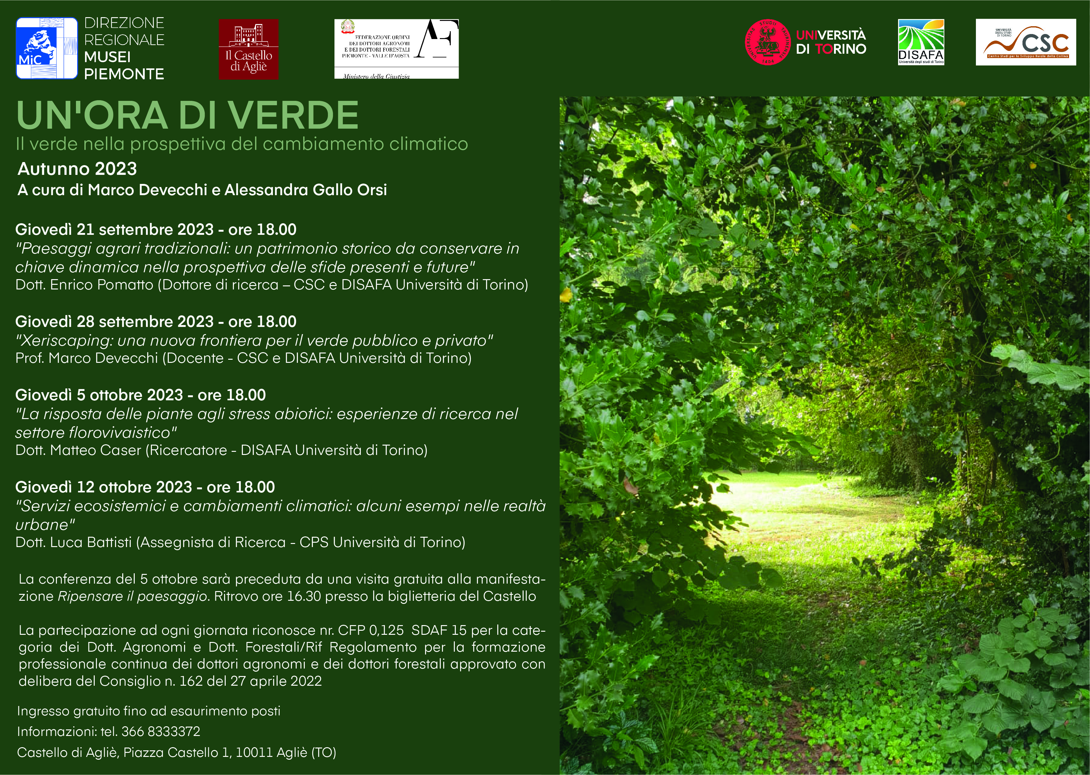 incentrati sul tema del verde nella prospettiva del cambiamento climatico. Apre la rassegna, giovedì 21 settembre, la conferenza Paesaggi agrari tradizionali: un patrimonio storico da conservare in chiave dinamica nella prospettiva delle sfide presenti e future di Enrico Pomatto, dottore di ricerca – DISAFA e Centro Studi per lo Sviluppo Rurale della Collina dell’Università di Torino. L’intervento si sofferma sulla vulnerabilità di un paesaggio agrario, direttamente correlata a tutta una serie di drivers di cambiamento sociali ed ambientali, tra cui il cambiamento climatico che richiede adattamenti agronomici mirati per rendere resilienti tali paesaggi, e prende in esame alcuni progetti di ricerca riguardanti i paesaggi vitivinicoli piemontesi condotti attraverso analisi storico-archivistiche, sopralluoghi in campo e indagini partecipate. Giovedì 28 settembre è la volta invece della conferenza Xeriscaping: una nuova frontiera per il verde pubblico e privato di Marco Devecchi, docente DISAFA e Centro Studi per lo Sviluppo Rurale della Collina dell’Università di Torino, nonché curatore dell’Ora di verde. La pratica progettuale denominata Xeriscaping ha come obiettivo la riduzione significativa del consumo di acque irrigue, ponendo una particolare attenzione sull’individuazione di specie di interesse ornamentale meno esigenti da un punto di vista idrico, accanto a innovative strategie agronomiche nella gestione della coltivazione delle piante. La conferenza illustra questi temi anche con esempi progettuali frutto dell’attività di ricerca svolta presso il DISAFA dell’Università di Torino. La risposta delle piante agli stress abiotici: esperienze di ricerca nel settore florovivaistico è al centro della relazione di Matteo Caser, ricercatore DISAFA dell’Università di Torino, in programma per giovedì 5 ottobre: negli ultimi anni, il rapido aumento delle temperature e la riduzione delle precipitazioni in una regione già interessata da estati molto calde e secche espone infatti l’area mediterranea al rischio ricorrente e concreto di forte siccità; nell’ambiente urbano mediterraneo, le piante devono quindi affrontare diverse condizioni abiotiche (ad esempio inquinamento atmosferico, scarsità d’acqua, contaminazione del suolo) che possono rappresentare fonti di stress, compromettendone la crescita e le qualità estetiche. Chiude il ciclo di conferenze, giovedì 12 ottobre, Luca Battisti, assegnista di ricerca – Dipartimento di CPS dell’Università di Torino), con Servizi ecosistemici e cambiamenti climatici: alcuni esempi nelle realtà urbane. I servizi ecosistemici sono i benefici che l’essere umano trae dal funzionamento di un ecosistema, compreso quello urbano e nelle aree urbanizzate molti di questi benefici sono forniti dalla componente verde, che ha la capacità di esercitare un effetto positivo a livello fisico e mentale, garantendo un benessere dei cittadini; la (co-)progettazione delle aree verdi e la loro collocazione all’interno del contesto urbano sono quindi questioni fondamentali per lo sviluppo di città più resilienti e sostenibili e, in riferimento alle tematiche affrontate, l’intervento intende divulgare alcuni esempi progettuali e ricerche condotte dall’Università di Torino.