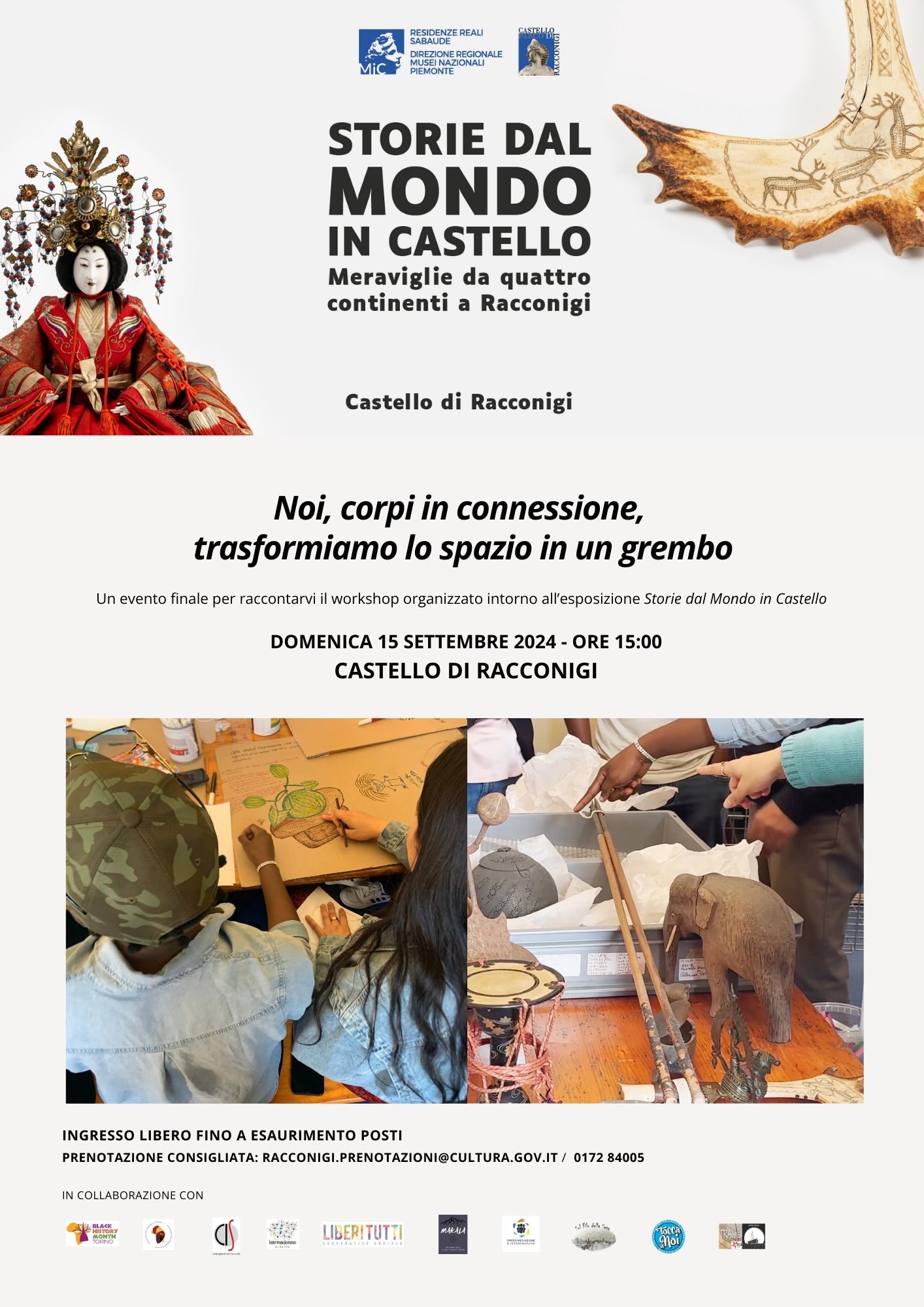 Domenica 15 settembre, alle ore 15.00, nel salone d’Ercole del Castello di Racconigi si terrà un evento finale per raccontare al pubblico i risultati del workshop partecipativo Noi, corpi in connessione, trasformiamo lo spazio in un grembo, che si è svolto il 10, 11 e 12 maggio scorso, nell’ambito del programma di attività collaterali promosso per l’apertura del nuovo percorso espositivo Storie dal Mondo in Castello.