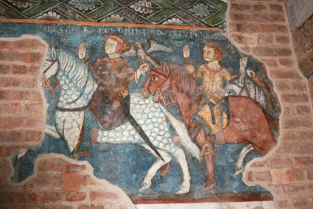 Due cavalieri con falconi da caccia alzano atterriti le mani al cielo nel veder comparire i tre morti, di cui purtroppo non resta traccia. L’iconografia medie dei defunti che ammoniscono i vivi a meditare sulla morte, tipica nella seconda metà del XIII secolo e presente in questo affresco del chiostro di Vezzolano del 1290 circa, è un evidente riferimento alla caducità della vita.