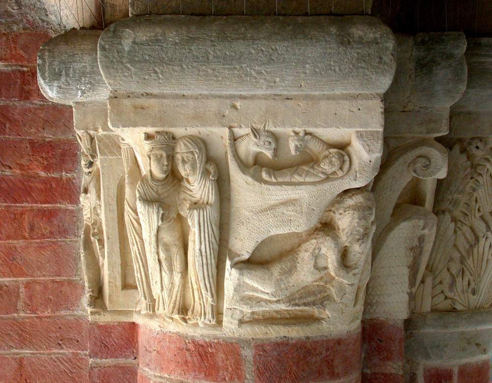 Tra i capolavori scultorei dell’Abbazia di Vezzolano spicca nel Chiostro un capitello incompiuto del 1180 circa che, come un libro di pietra, racconta in un unico contesto l’Annunciazione, la Visitazione e la Natività. La scena del bimbo scaldato dal bue e dall’asinello trae ispirazione da scritti apocrifi che celebrano anche il tema della regalità di Maria, a cui è dedicato l’intero complesso.