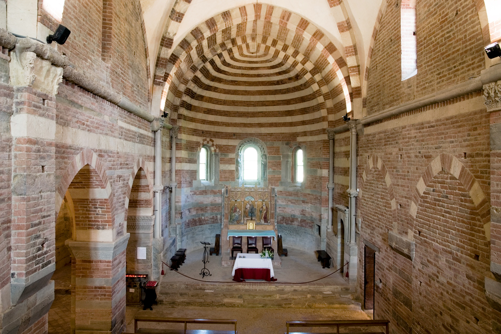 La Chiesa di Santa Maria di Vezzolano, costruita a partire dalla seconda metà del XII secolo, presenta una navata centrale scandita in tre campate da robusti pilastri di linguaggio romanico e volte a crociera costolonate di gusto gotico, ed è ritmata dall’alternanza cromatica del cotto e dell’arenaria. La monofora centrale dell’abside è arricchita da una decorazione scultorea del 1180 raffigurante l’Annunciazione della Vergine.