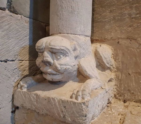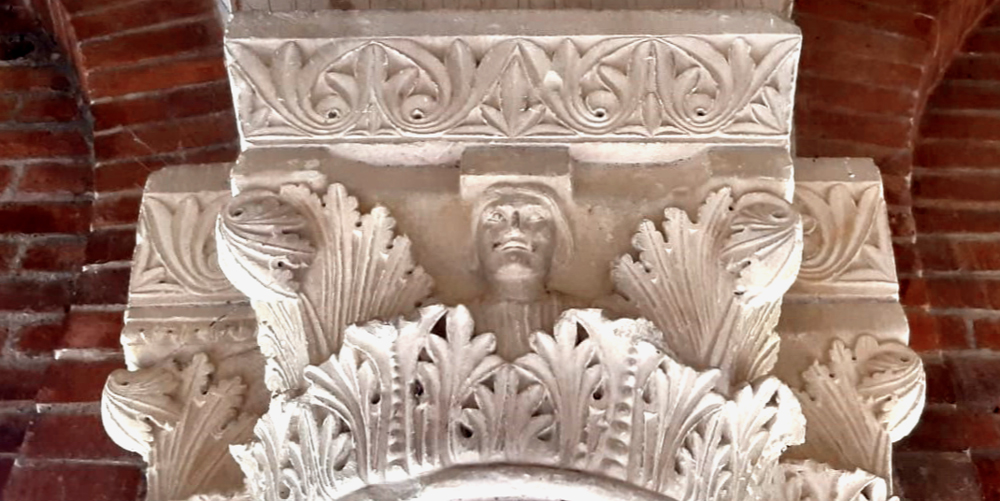 L’apparato decorativo delle chiese romaniche è ricco di immagini simboliche, spesso riconducibili a tradizioni precristiane, ma anche di figure inserite in contesti inconsueti. Non poche sono le ‘insolite presenze’ che si possono scorgere all’Abbazia di Vezzolano, dove, ad esempio, in uno dei capitelli del chiostro, opera risalente al 1180 circa, tra le foglie di acanto si affaccia un busto maschile che indossa una tunica a fitte pieghe e sfoggia un’acconciatura con capelli a caschetto.