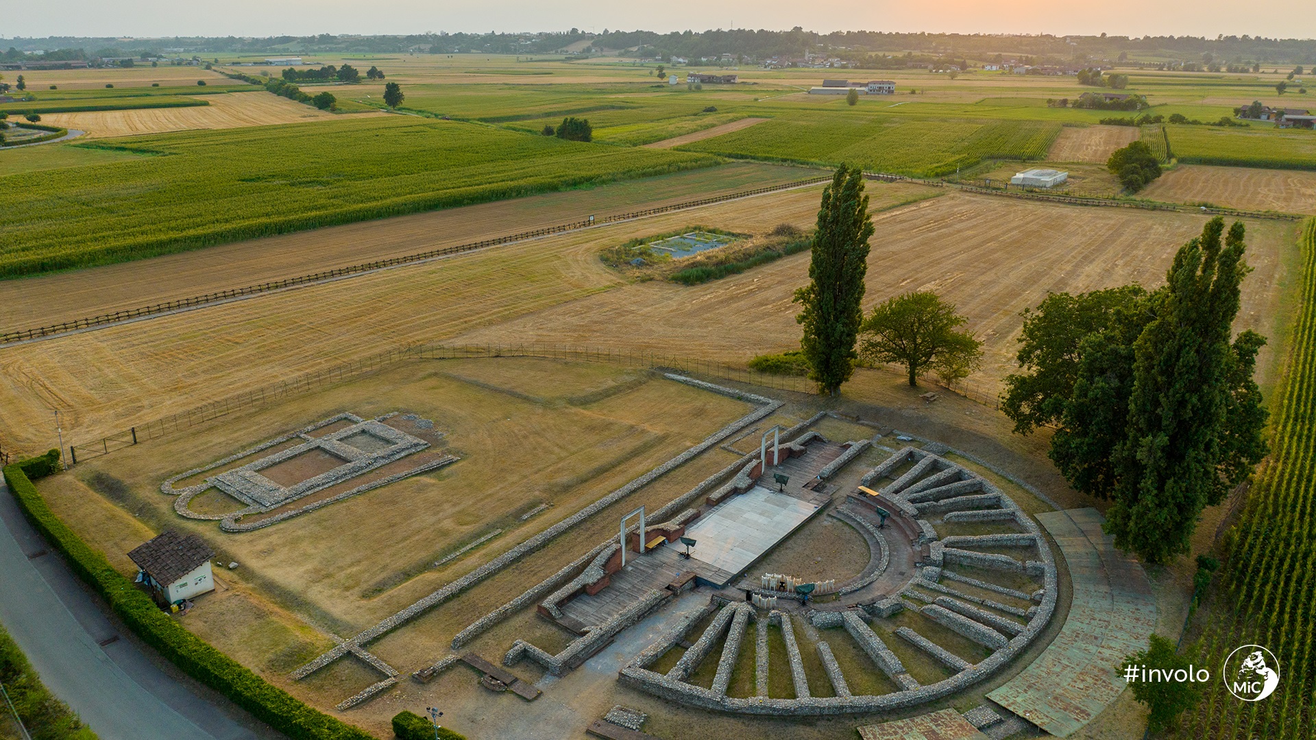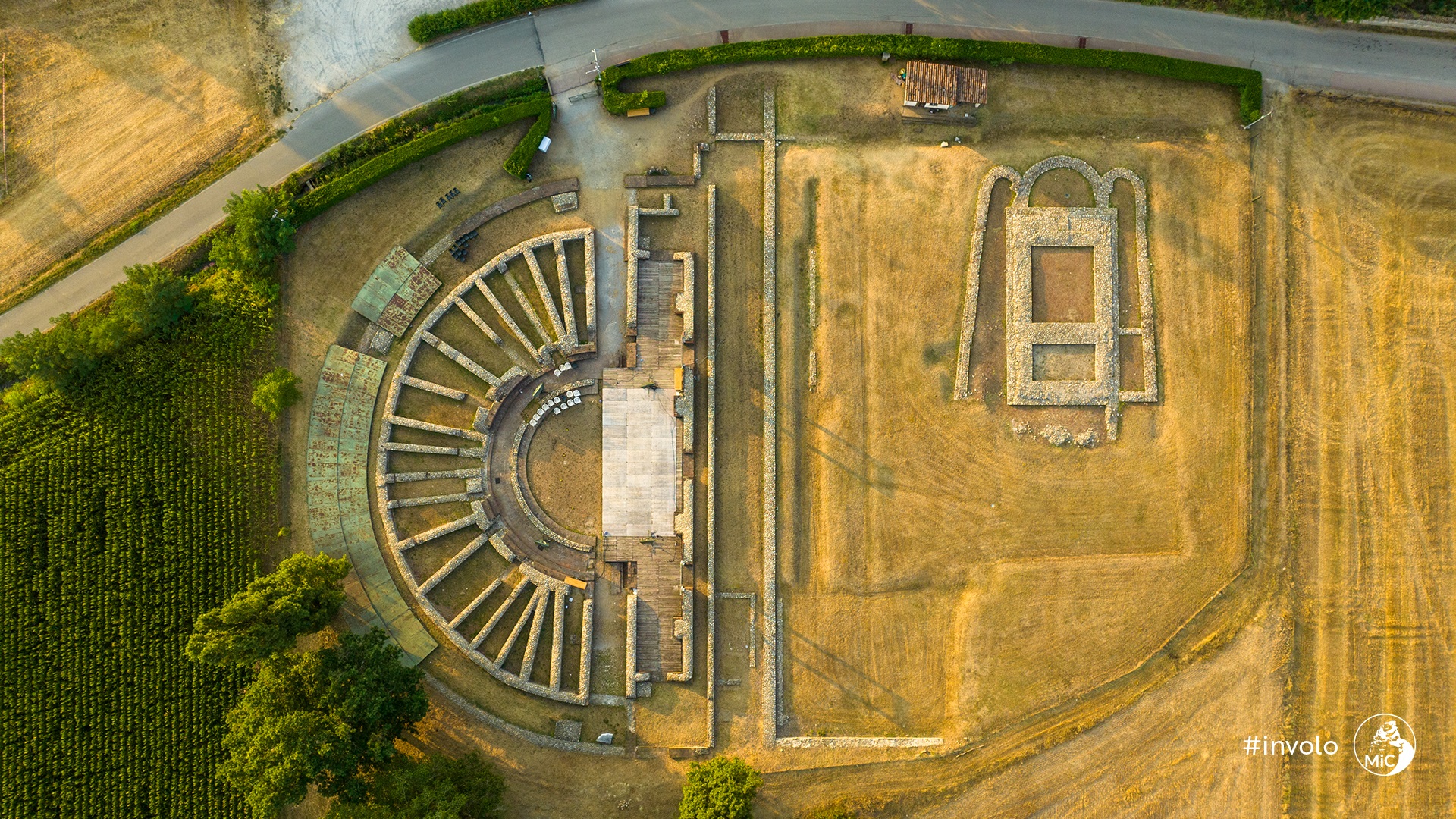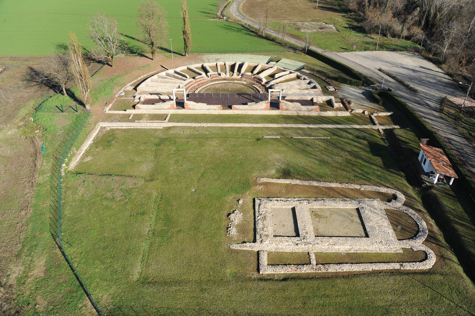 L’area del complesso del teatro con in primo piano i resti della basilica cristiana costruita sopra il tempio romano sorto al centro del quadriportico.