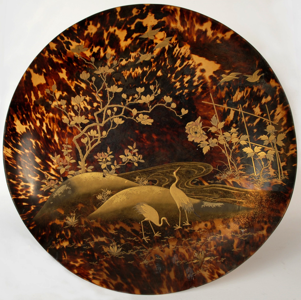 Il Castello di Agliè possiede una collezione orientale di circa centottanta pezzi, per lo più esposta nella Sala Cinese, che fu raccolta dal duca Tomaso di Savoia-Genova durante la spedizione sulla corvetta Vettor Pisani dal 1879 al 1881. Tra questi oggetti si conserva un grande piatto in carapace di tartaruga del diametro di 44 cm, opera di manifattura giapponese realizzata con la tecnica della lacca d’oro, “makie” letteralmente “pittura cosparsa”.