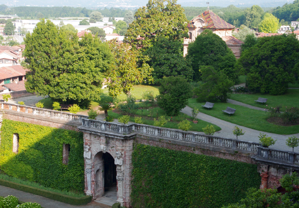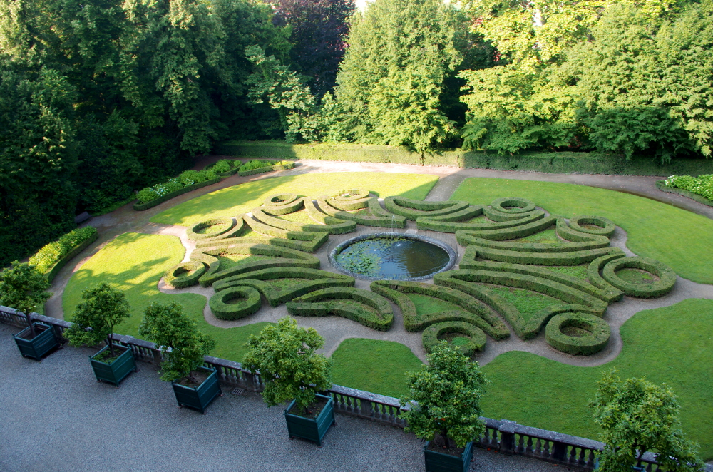 Giardino all’italiana realizzato con siepi di bosso ”Buxus sempervirens” risalente al 1867 circa probabilmente realizzato dal giardiniere Antonio Capello sullo stile preesistente e risalente al progetto di Michel Bernard del 1771 che aveva caratterizzato l’intera superficie del Parco e del Giardino di Agliè. In primo piano cassoni in legno e ghisa contenenti aranci amari “Citrus aurantium” secolari, un tempo situati a Palazzo Reale di Torino.