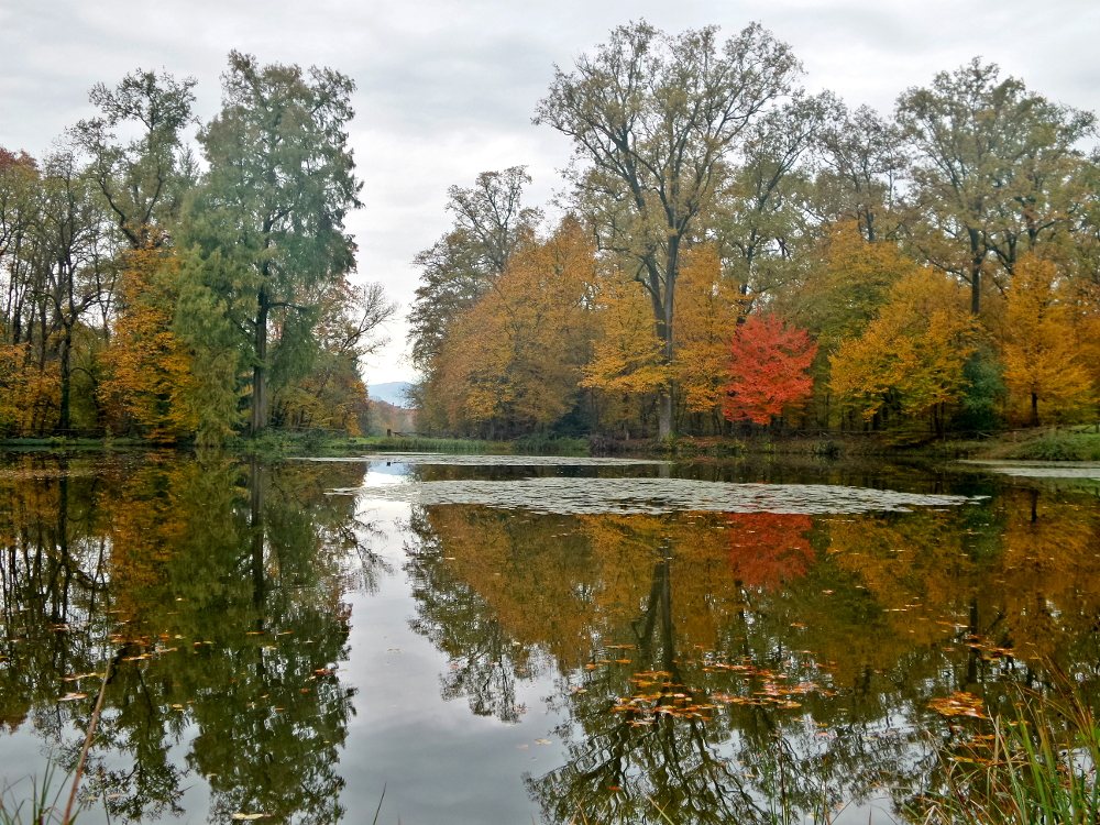 Foliage autunnale, al Castello di Agliè, che si riflette nell’acqua del lago situato nel Parco che fu progettato dal paesaggista tedesco Xavier Kurten tra il 1830 e il 1840. Al centro del lago un gruppo di ninfee, a destra un carpino con insolita colorazione rossa anziché gialla, mentre a sinistra un Taxodium disticum, verde, o cipresso calvo. In lontananza, sullo sfondo, si intravede il Castello.